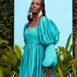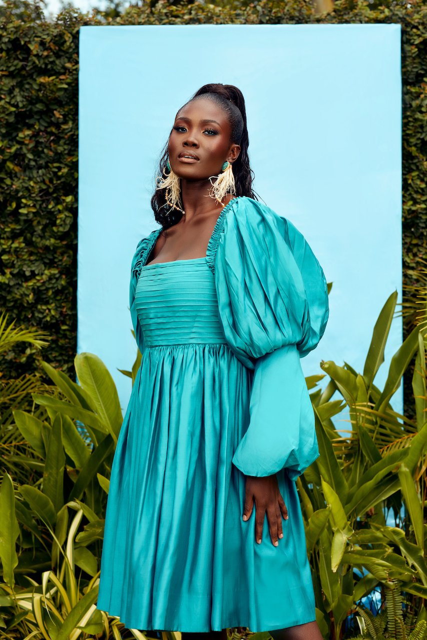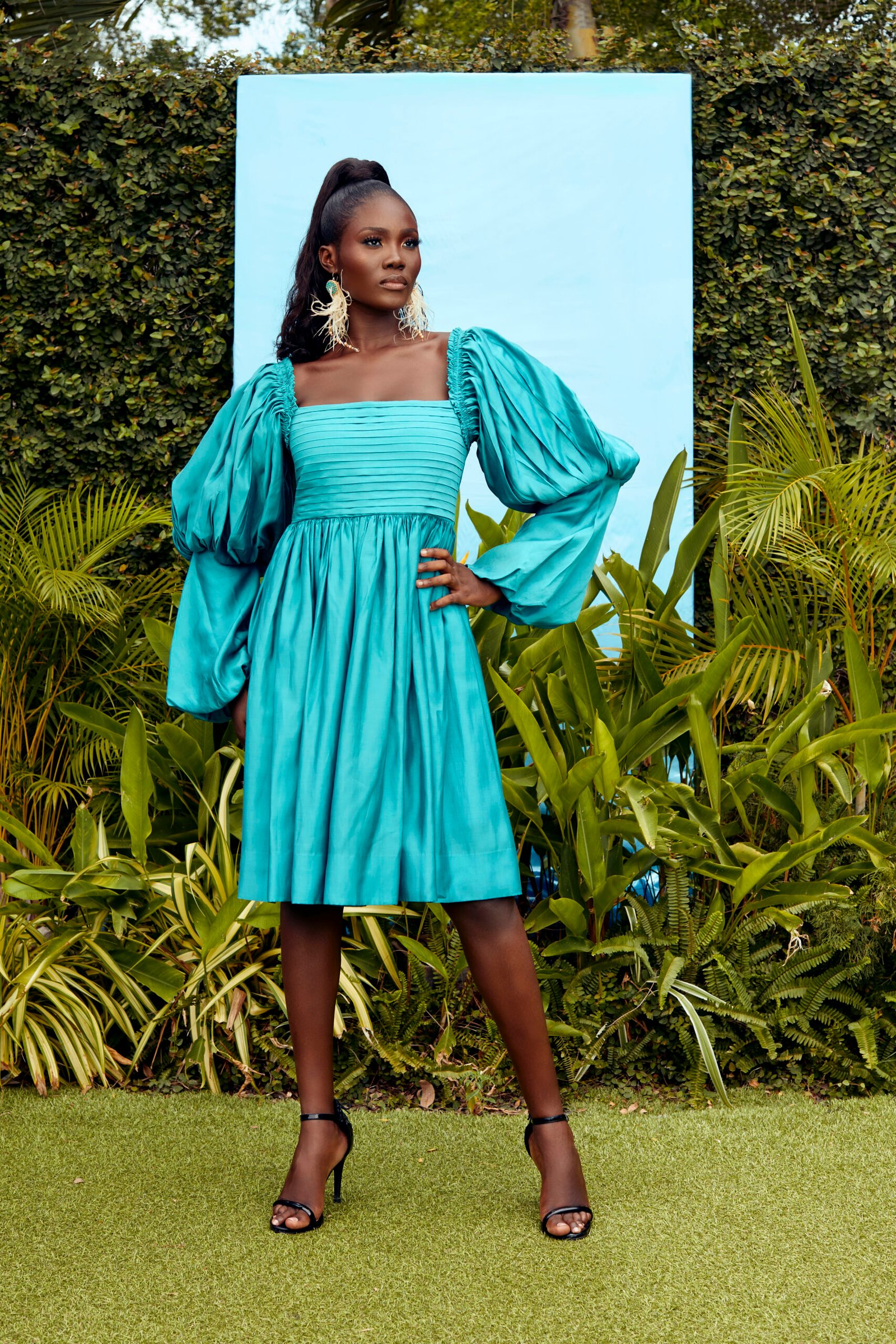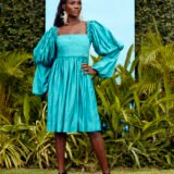 Embrace the beauty of this Knee length Turquoise dress with a Pintucks details and a Dramatic sleeves