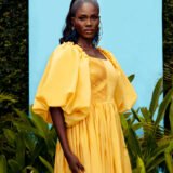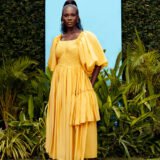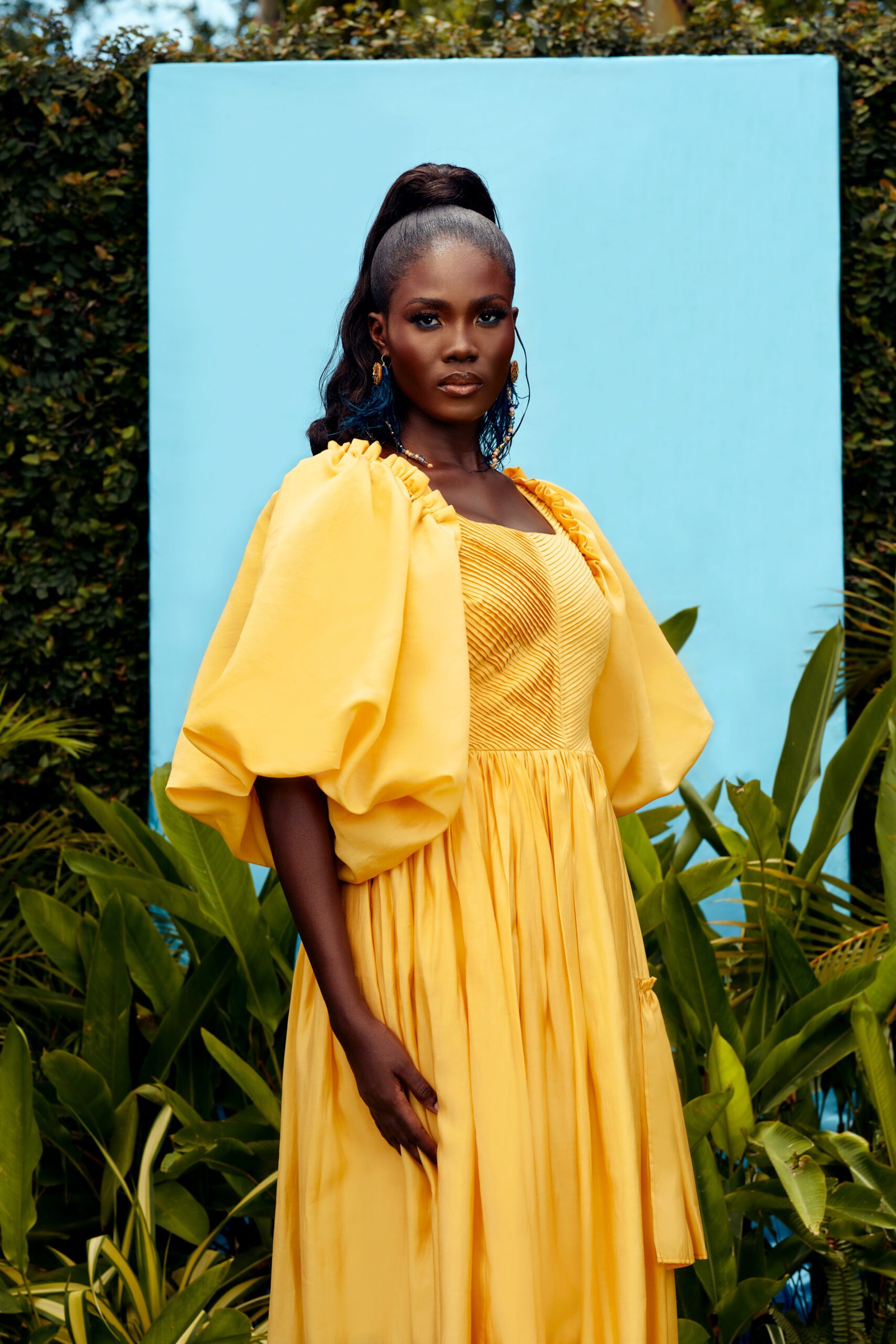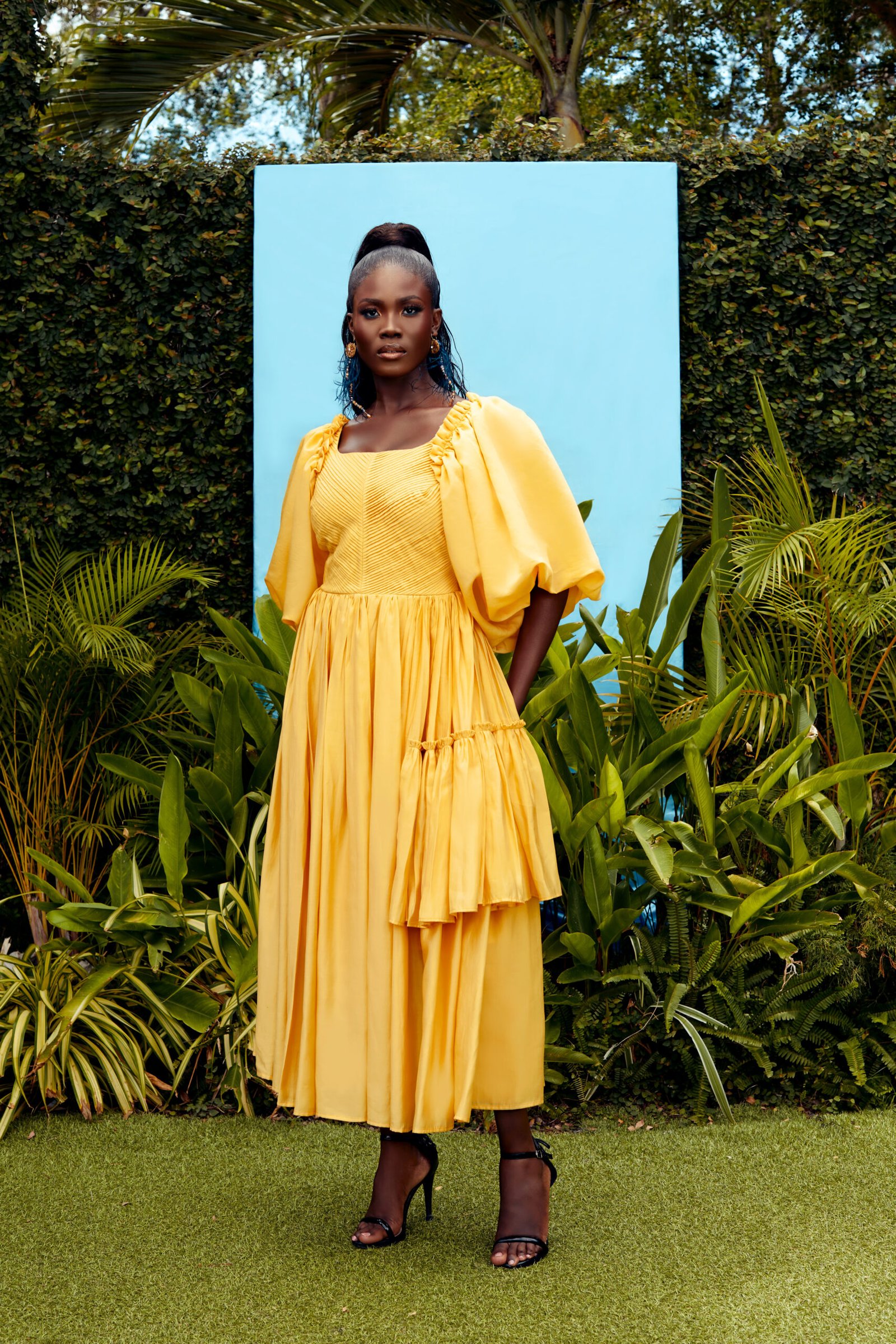 Adorn yourself in this exquisite Yellow midi Pintuck Bodice dress with a gathered full bottom and a Puff sleeves