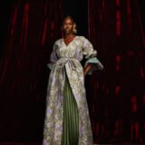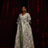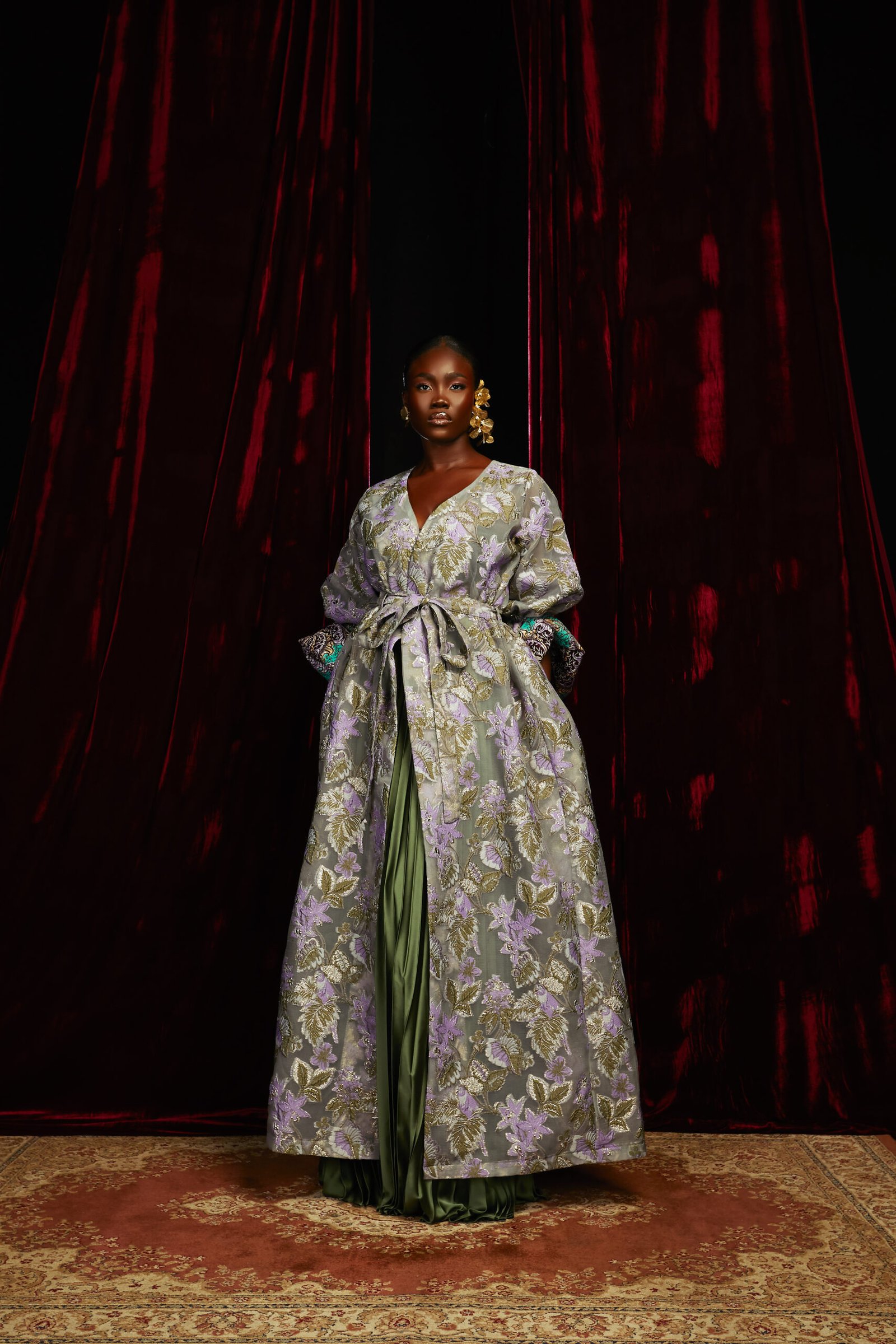 Gold metallic brocade and Ankara print. This floor length Puff sleeves kimono shows a contrasting cuff made from our Ankara print.