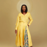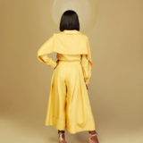 Curry Linen Crafted into a Culotte with an insert of our Printed Hand pleated crepe fabric on side.