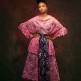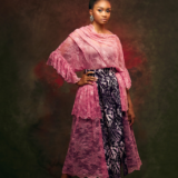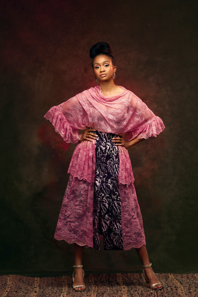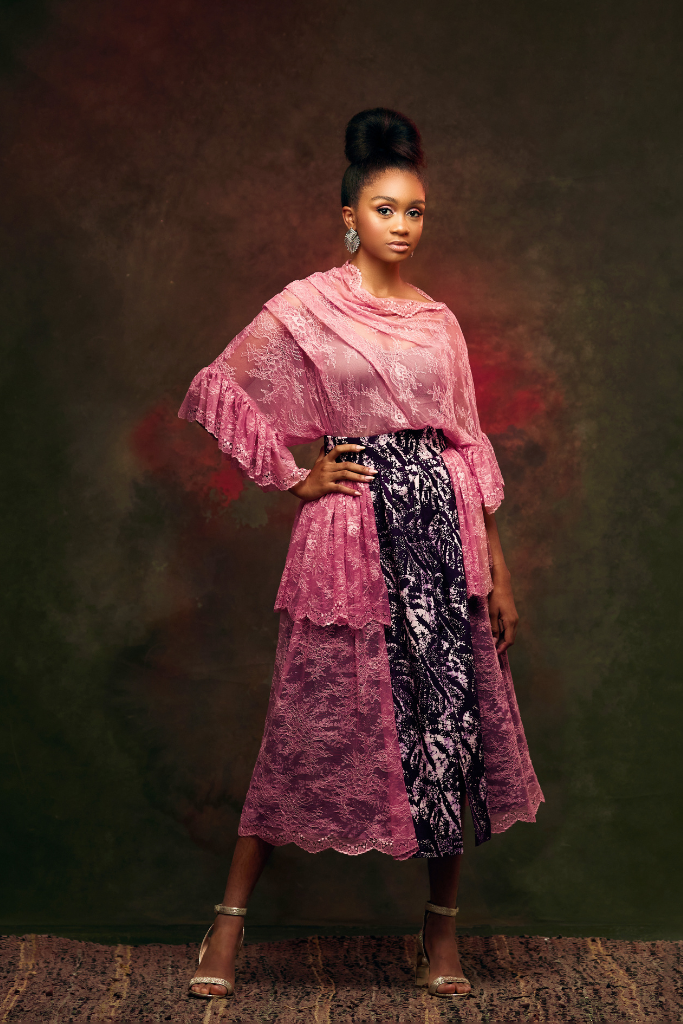 Chantilly lace and Cotton batik layered Midi skirt with a sexy slit right in the middle of the skirt. This look is paired with Sade blouse in Dusty pink