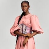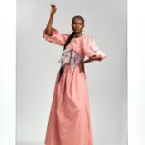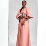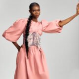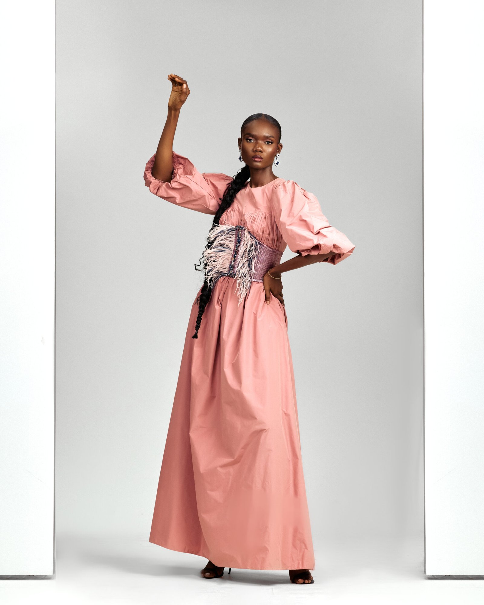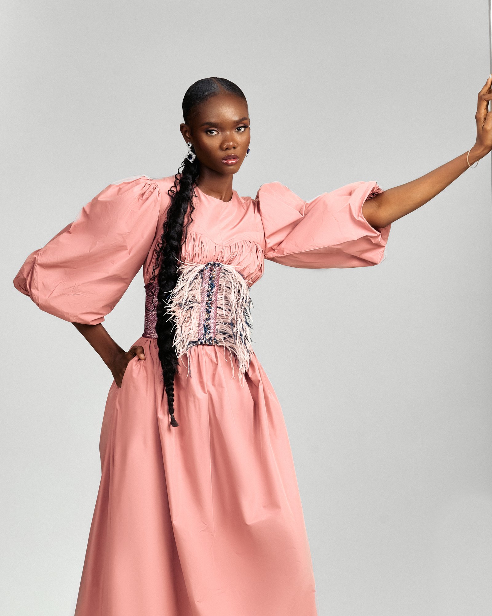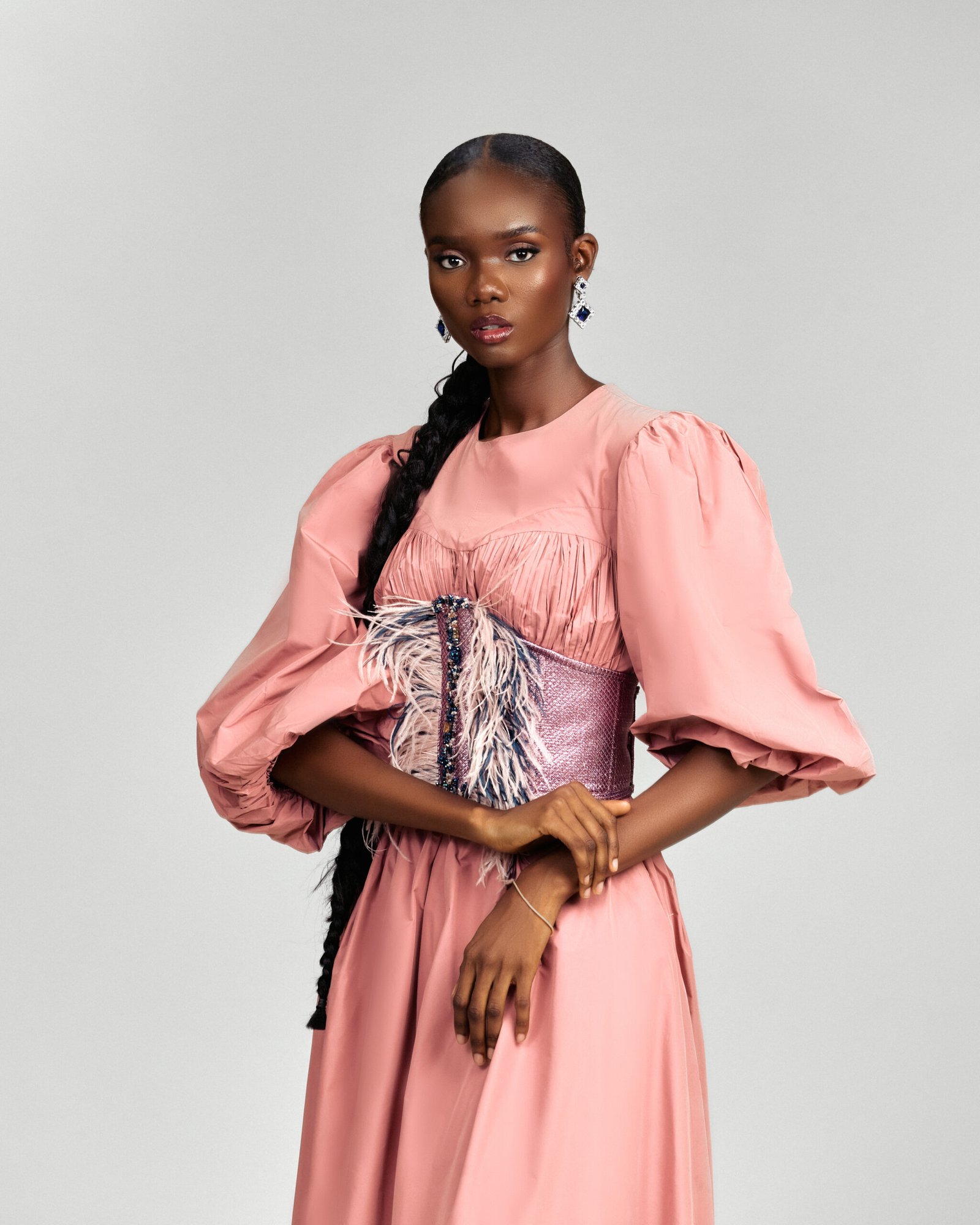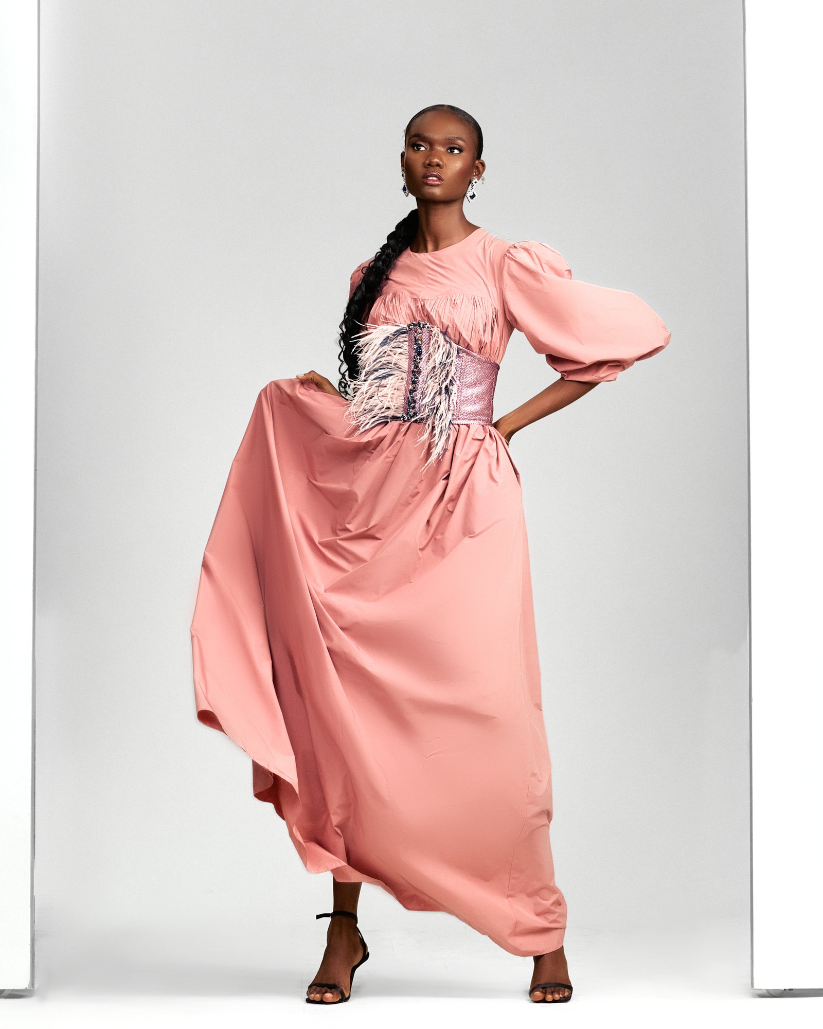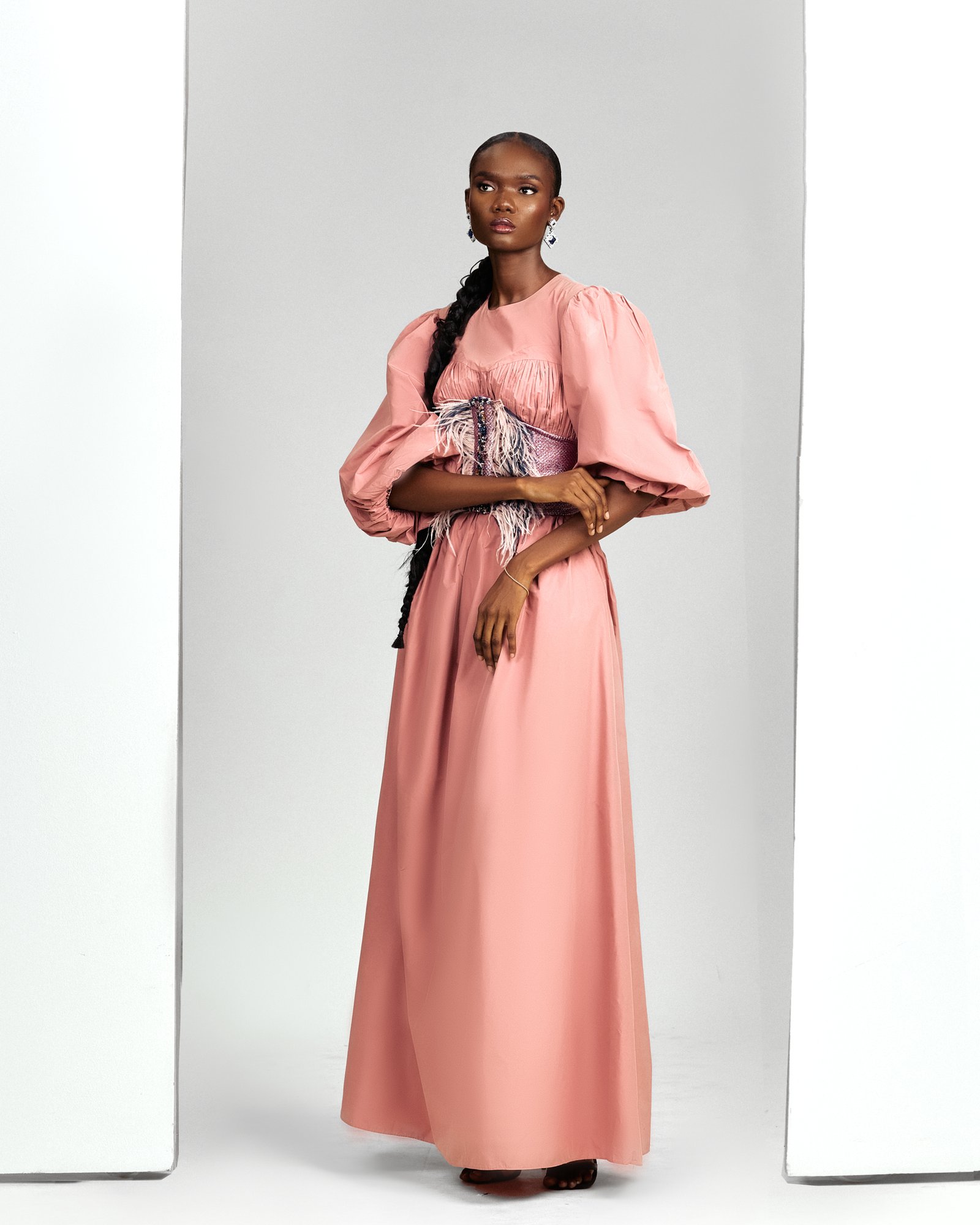Plain taffetta Maxi dress with burst tucks details, balloon sleeves and a full button paired with feather detailed corset Belt